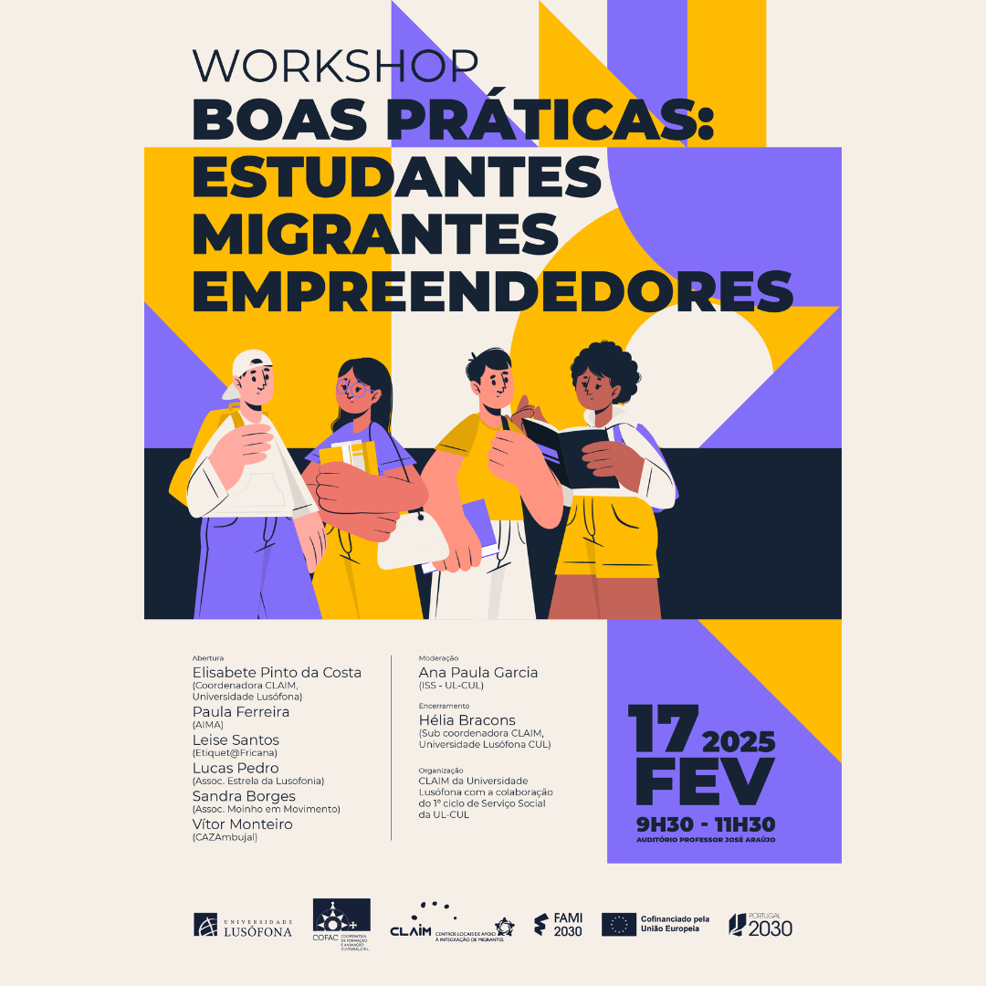 A Universidade Lusófona, através do Centro Local de Apoio à Integração de Migrantes (CLAIM), promove o workshop gratuito "Boas Práticas: Estudantes Migrantes Empreendedores" no dia 17 de fevereiro de 2025, no Auditório Professor José Araújo, Centro Universitário Lisboa. Este evento procura destacar as experiências de estudantes e ex-estudantes da Universidade Lusófona que se têm destacado no empreendedorismo, partilhando os desafios e sucessos que viveram enquanto migrantes.
